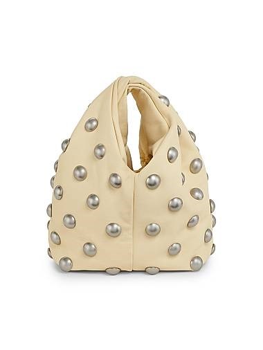 Сумка на рукоятке из мягкой кожи с украшением в виде серебряных заклепок и закрученной ручкой.