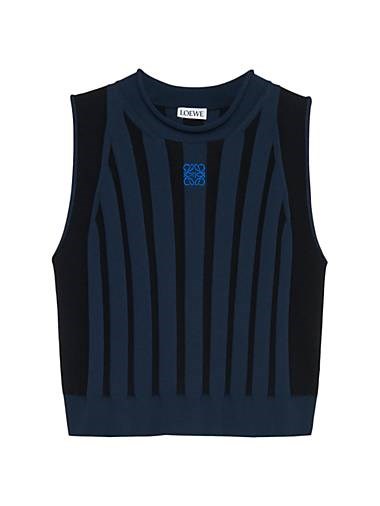 Топ без рукавов от Loewe, выполненный в Италии, отличается рельефным дизайном с контрастными полосами и логотипом в центре.