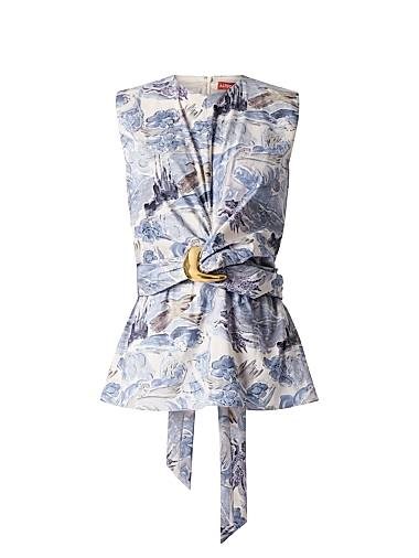Топ Tizzy от Altuzarra выполнен в художественном принте и отличается элегантным поясом с золотой пряжкой.