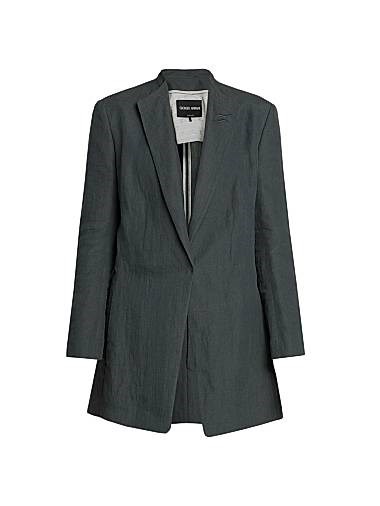 Блейзер из компактного льна от Giorgio Armani выделяется пиковыми лацканами, карманами и двойными вентиляционными отверстиями на спине. Потайная застежка на кнопке завершает этот однобортный силуэт.