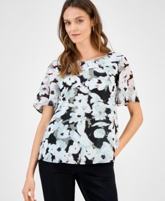 Блуза Kasper с принтом и швейцарскими точками, короткими летящими рукавами и лодочным вырезом, 100% полиэстер