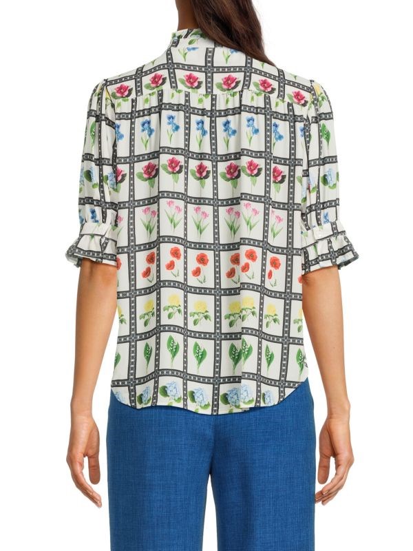 Эта блузка с разрезом от T Tahari украшена ярким цветочным мотивом.