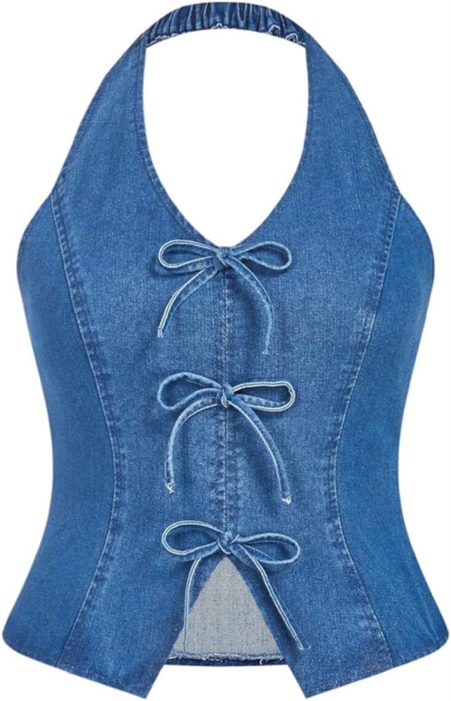 Дизайн: без рукавов, с воротником-адаптером, бант спереди и разрезом по низу, в стиле Y2K.