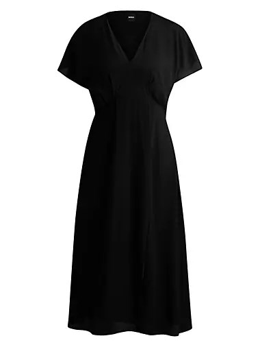 Это современное платье от Boss Womenswear позволит вам легко переходить от дня к ночи. Платье с глубоким V-образным вырезом и короткими рукавами с разрезами для свободы движений выполнено из мягко струящегося шелка с микродизайном в горошек. Крой пояса создает эффект flattering.