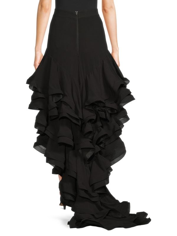 Ассиметричный подол с удлинением создает объем и театральное движение, подчеркивая элегантный силуэт.