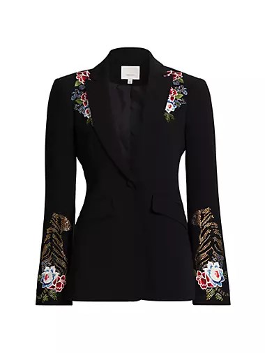 Этот жакет Le Beau Tigre Cheyenne сочетает тигровую и цветочную вышивку с кристальной отделкой, превращая классический предмет в стильную вещь.