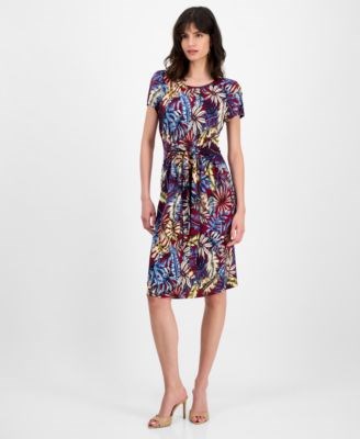 Connected Платье женское приталенное с принтом и завязкой спереди, мягкий трикотаж, короткий рукав