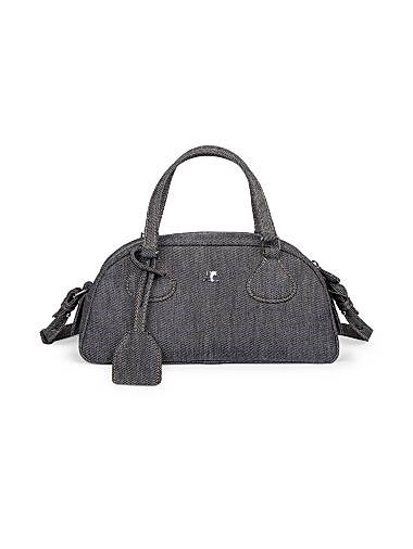 Сумка-багет выполнена из денима и оснащена двумя верхними ручками.