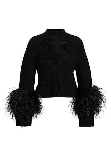 Свитер изготовлен из резинки из мериносовой шерсти и имеет пушистые перьевидные манжеты на рукавах, а также воротник-стойку.