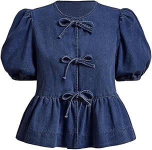 Джинсовая блуза GORGLITTER с передними завязками, короткими рукавами, рюшами и баской для женщин