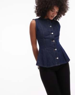 Джинсовый топ Topshop индиго с плиссированной оборкой, обычной посадкой, круглым вырезом и пуговичной планкой