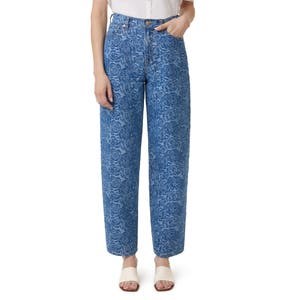 Эти стильные джинсы с высоким талией украшены шикарным жаккардовым узором в виде роз и слегка расклешены к низу, создавая модный силуэт бочки.