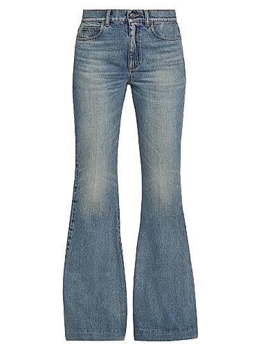 Джинсы McQueen выполнены из стертого денима, имеют завышенную талию и расклешённый крой.