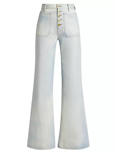 Джинсы Gwynne от Ulla Johnson имеют силуэт с высокой талией и широкими штанинами, украшенные золотистой кнопкой с логотипом.