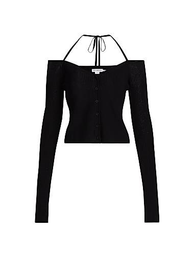 Эластичный лонгслив с открытыми плечами от Good American выполнен из мягкой рифлёной ткани и имеет регулируемую завязку на шее, а также облегающие длинные рукава.