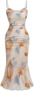 Особенности: Принт тай-дай, сетчатая ткань, бретельки, вырез сердечком, без рукавов, открытая спина, отделка краев, облегающий силуэт, макси-длинна.