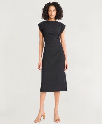 Элегантное текстурированное миди-платье Luxely с рюшами, короткими рукавами и лодочным вырезом