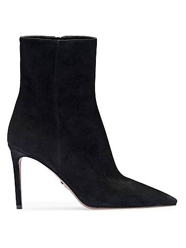 Элегантные замшевые ботильоны Prada с высоким каблуком, зауженным носком и металлическим логотипом