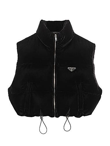Функциональный вельветовый жилет Prada с утячиным пухом, воротником-стойкой и значком в виде треугольника