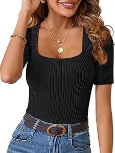 Эта стильная футболка с коротким рукавом идеально подходит для весенне-летнего сезона. Квадратный вырез подчеркивает шею и ключицы, а ребристая вязка мягко гладит тело, выделяя ваши формы. Одевайте её как самостоятельно, так и в слоях. Отлично смотрится в сочетании с джинсами, юбками, кардиганами и жакетами.