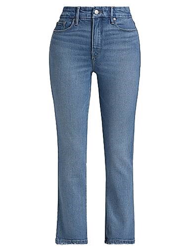Джинсы Good American Good Legs с прямыми штанинами и укороченным дизайном. Завершает изделие необработанный подол.