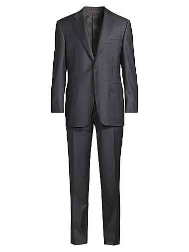 Костюм из шерсти Canali представляет собой образец классического кроя с однобортным пиджаком и зауженными брюками с прессом.