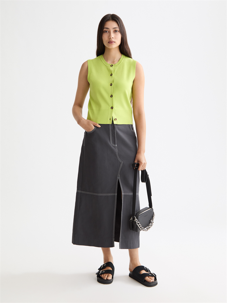 Её высокая посадка подчеркивает фигуру, а разрез спереди добавляет изюминку образу.