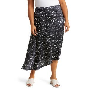 Эта очаровательная юбка в горошек выделяется драпированной боковой панелью, добавляющей выразительности.