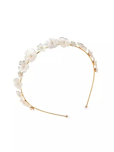 Обруч для волос Jenna аккуратно украшен изысканными цветами из перламутра на проволоке, покрытой 18К золотом.