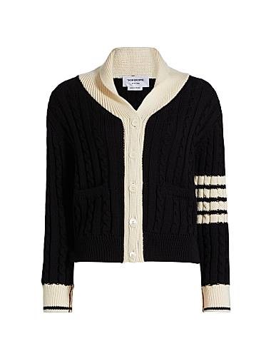 Этот кардиган из итальянской шерсти Thom Browne с косичками отличается контрастным воротником и планкой.