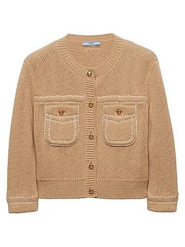 Кардиган из хлопка Prada с рукавами 3/4, воротником, накладными карманами и контрастной вышивкой
