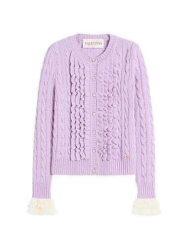 Кардиган из шерсти от Valentino Garavani с мохеровыми рюшами на манжетах и пуговицами из перламутра и страз