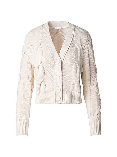 Изготовленный из крупной хлопковой смеси с косой вязкой, кардиган Akris punto с V-образным вырезом подчеркивает опущенные плечи и отделку с резинкой.