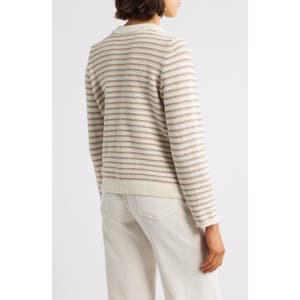 Усовершенствованные большие кнопки украшает планку этого кардигана с полосками, вязанного с удобными карманами для непринужденного стиля.