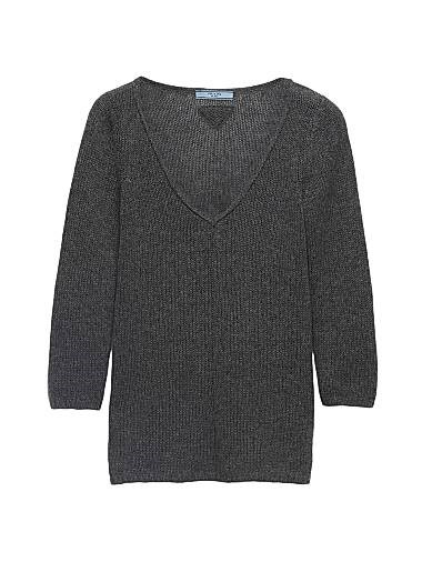 Кашемировый свитер Prada с V-образным вырезом, трёхчетвертными рукавами и обтягивающим силуэтом