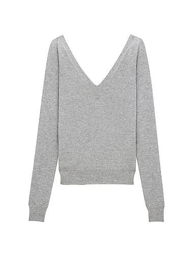 Свитер с V-образным вырезом спереди и сзади, а также открытыми деталями.
