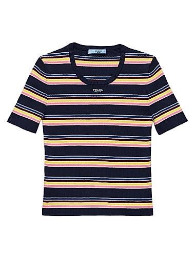 Хлопковый свитер Prada с коротким рукавом, облегающим силуэтом, полосками и вышитым логотипом