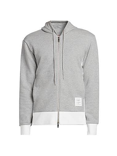 Худи выполнено из хлопкового трикотажа с фактурной изнанкой. На левой стороне находится фирменный логотип Thom Browne с четырьмя полосами.