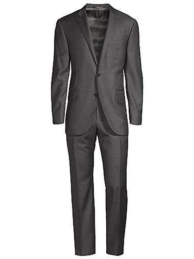Этот стильный костюм состоит из пиджака и брюк, сшитых из шерстяной ткани. Регулярный крой. Изготовлено из новой шерсти и требует химчистки.