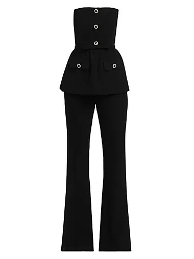 Комбинезон выполнен из эластичного крeпа и оформлен безрукавным банданным лифом, поясом с баской и пуговицами с кристаллом.