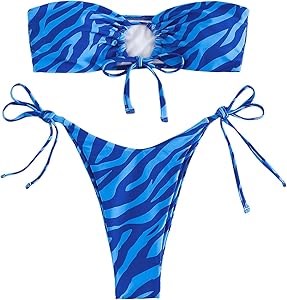 Характеристики: комплект из 2 предметов, зебровый принт, вырез в форме кольца, шнурок, бюстгальтер с застежкой на бретелях и трусы-бикини на завязках.