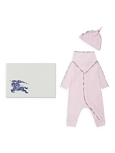 Этот набор для девочек включает в себя шапочку, бандану для кормления и комбинезон с воротником Питер Пэн. Дизайны оформлены характерной клетчатой отделкой Burberry.