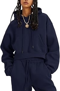 Дизайн: Теплый флисовый спортивный костюм для женщин, однотонный, с капюшоном и регулируемыми шнурками, лонгслив, укороченная длина, карман-кенгуру, высокая талия, эластичный пояс с шнурком, два боковых кармана, эластичные манжеты, которые согреют вас даже в прохладную погоду.