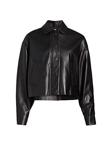 Кожаная куртка Everli от Simkhai имеет укороченный силуэт и расклешенный воротник.