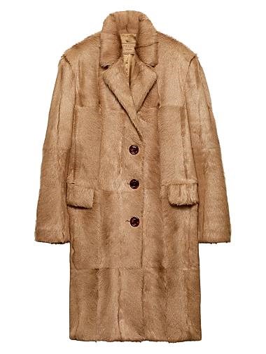 Это кожаное пальто с утончённым современным характером привлекает внимание двойственными элементами и тонкими контрастами, которые подчеркивают силуэт, вдохновленный мужской модой.