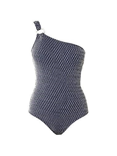 Этот купальник от Shoshanna выполнен с оригинальным вырезом на одном плече и волнистым рибой контрастного цвета.