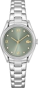 Стильные часы Lacoste Parisienne с корпусом диаметром 30 мм, полированной рамкой и римскими цифрами, оснащены кристаллическими индексами и солнечным циферблатом с крокодилом.