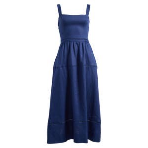 Сшито из лёгкого льна, это летнее платье миди с квадратным вырезом имеет фактурную строчку, создающую воздушный шарм, и расклешённую юбку, которая красиво колеблется при каждом шаге.