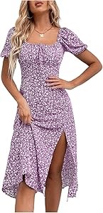 Льняное платье милкмейд с цветочным принтом, рукавами-пуфф и разрезом, от Floerns, миди длины, 100% полиэстер