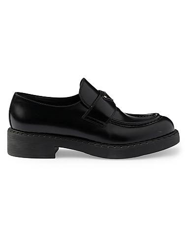 Эти лоферы, вдохновленные ретро-дизайном, выделяются знаменитым эмалевым треугольным логотипом. Они изготовлены из тертой кожи, которая традиционно используется в классической обуви, но в коллекциях Prada переосмыслена в неожиданных дизайнах, создавая гибридный результат, отражающий двойственность бренда. Фактура подошвы с вырезами придаёт обуви ручной работы уникальный вид.